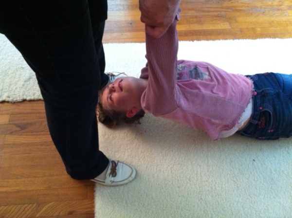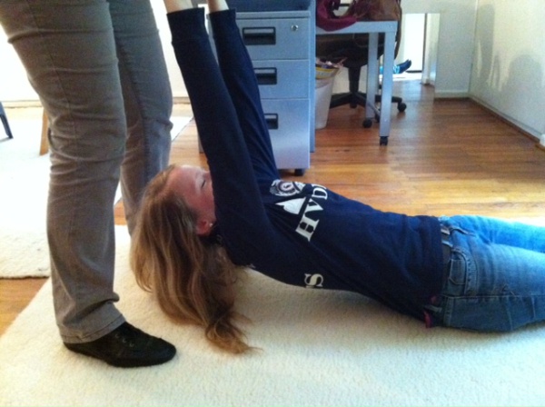 Der Kopf der Klientin fällt nach hinten, wenn der Körper an beiden Armen hochgezogen wird. Dabei verhält sich der Körper wie ein Mehlsack.