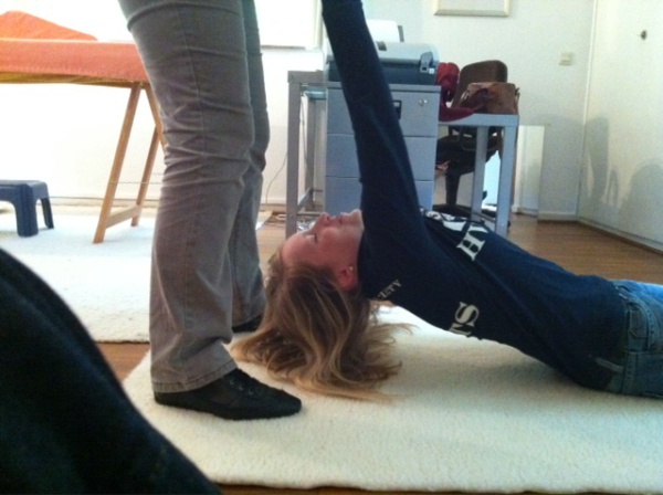 Der Kopf der Klientin geht von alleine in einer Linie mit der Wirbelsäule hoch, wenn der Körper an beiden Armen hochgezogen wird. Der Körper verhält sich wieder wie ein Mehlsack.