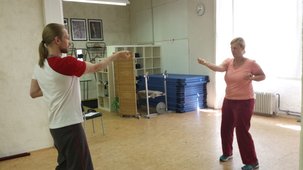 Sie konzentriert sich, spürt in ihren Körper hinein und schließt die Augen. Dann beginnt die fließende Abfolge der Bewegungen – zunächst die Arme vor dem Körper und zu den Seiten, später kommen die Beine hinzu. An einer Stelle irrt sie sich, sammelt sich, um kurz danach wieder einzusteigen – bis die Übung beendet ist. „Wenn man es richtig macht, sieht es aus wie eine tanzende Meditation“, erklärt sie noch leicht außer Atem, aber zufrieden. Es ist die erste Formübung SIU-NIM-TAU, deren sechs Sinnesabschnitte sie studiert.